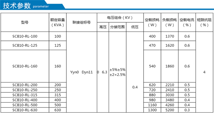 10KV級(jí)SCB10-RL-RL系列卷鐵心干式變壓器主要性能參數(shù):